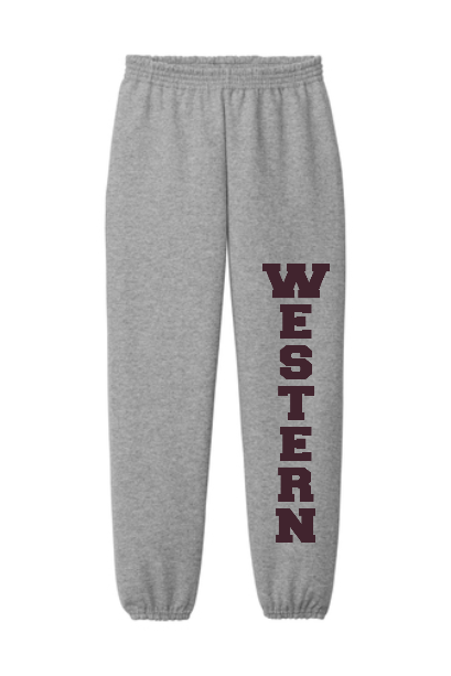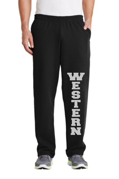 9-ounce, 50/50 cotton/poly fleece Air jet yarn for softness Removable tag for comfort and relabeling Elastic waistband with drawcord Elastic bottom cuffs ADULT SIZING OPEN HEM WITH POCKETS Includes logo printed on LEG